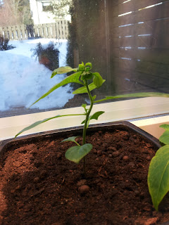 Ahdasta tulee ennen kuin näillä yöpakkasilla ulkona on tarpeeksi lämmintä. Ulkona on yli metri lunta terassin reunalla ja se on piukkaan pakattua kolauslunta. Viime vuonna chilit menivät liian aikaisin ulos, päivän minimilämpötilat olivat liian alhaiset ja kasvu oli käytännössä kuukauden verran ainakin jäissä. Tänä vuonna on lomamatka kesäkuun alussa ja mielellään haluaisin chilit ulos ja isompaan ruukkuun ennen sitä, jotta chilitarhanhoitajien ei tarvitsisi joka päivä tulla noita kastelemaan. Tähän on vielä aikaa pari kuukautta, joten paljon kerkiää vielä tapahtumaan. Ehkä se kesä sieltä vielä tulee.