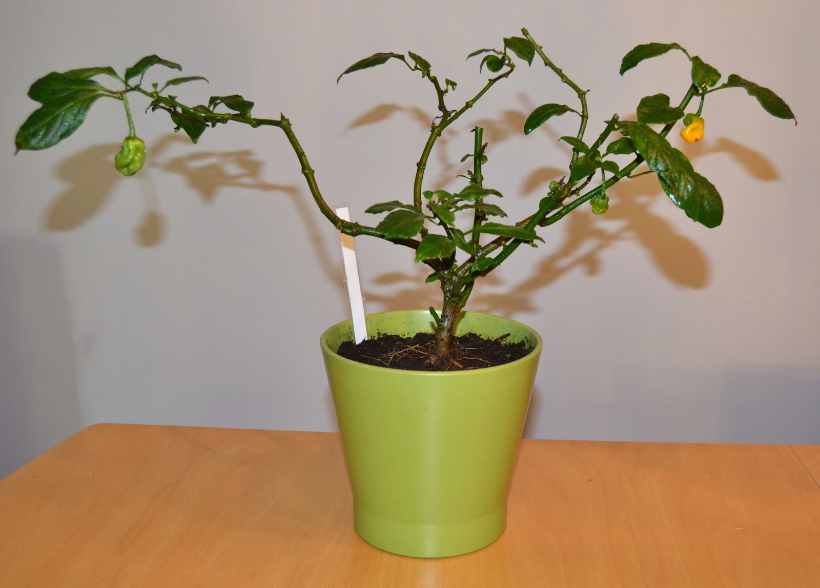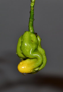 Madame Jeanette (C. Chinense) oli jo mielenkiintoisen kuuloinen nimensä perusteella ja moni oli etukäteen kehunut tämän makua. Odotin innolla oliko minun siemeneni aitoja, kun foorumilla lähes kaikilla tämä kypsyikin punaiseksi ja osoittautui vale Madame Jeaneteksi. Aito Madame kypsyy keltaisen väriseksi ja monella tämän niminen chili taisi ollakin Surinam Red, hyvänmakuinen sekin ja todella läheistä sukua Madame Jeanetelle. Käsittääkseni aito Madame Jeanette on myös Surinamista kotoisin.